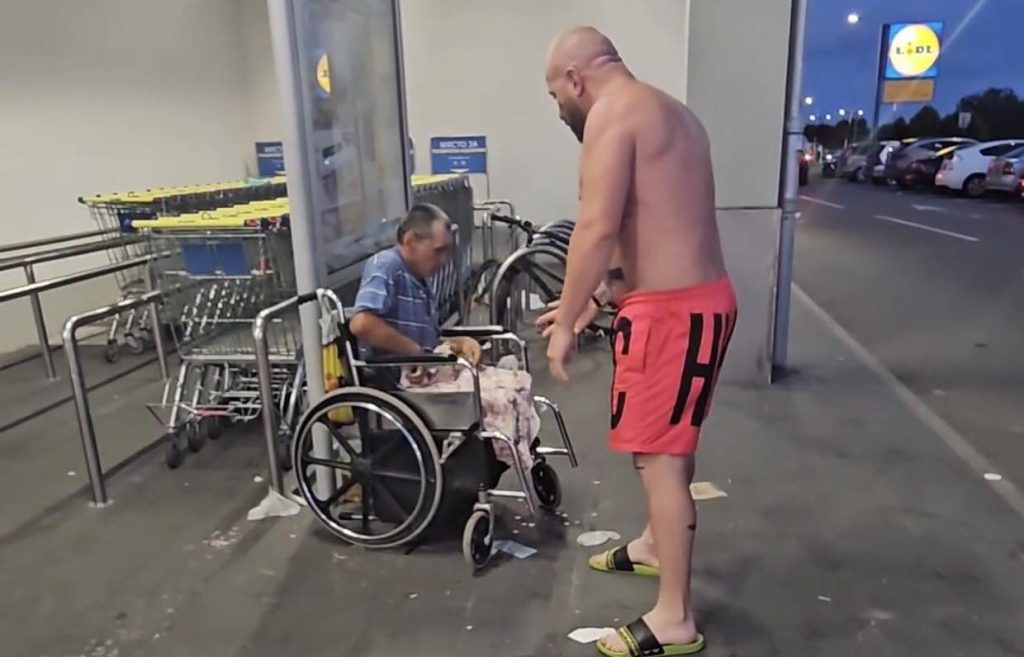 Ямболията свали мъж от инвалидна количка, който се оказа, че може да стои сам на краката си, показват кадри в мрежата.