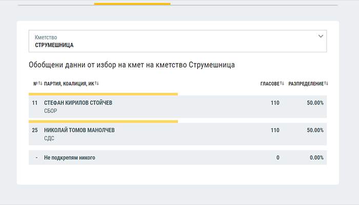 110:110 гласа или 50:50% за Николай Манолчев и Стефан Стойчев. На първия тур 34% има кандидатът Николай Томов Манолчев от СДС в Струмешница, а 28% – Стефан Кирилов Стойчев от СБОР.