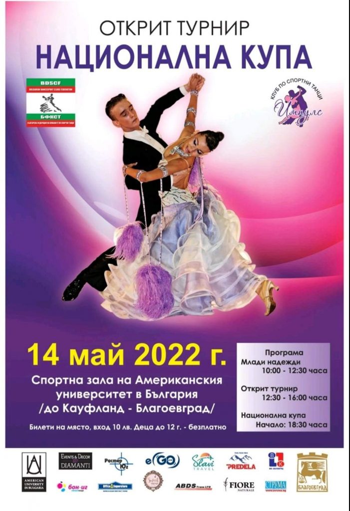 Над 150 двойки по спортни танци от цяла България пристигат в Благоевград за състезанията Национална купа, Открит турнир и “Млади надежди”. На 14 май /събота/ от 18.30 часа в спортната зала на Американския университет в България спортни клубове от цялата страна ще представят красота и високо спортно майсторство. Категориите, в които талантливите танцьори ще се състезават са: „Деца до 9 години“ , „Деца до 11 години“, „Юноши младша възраст /ЮМВ/“ и „Юноши старша възраст /ЮСВ/“, „Младежи“ и „Състезатели над 19 години“.
