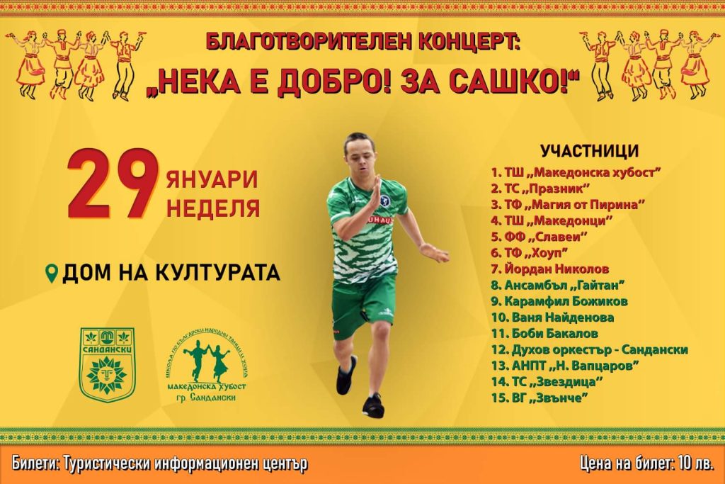 Община Сандански и Школа по народни танци и хора „Македонска хубост“ организират Благотворителен концерт „Нека е добро! За Сашко!“.