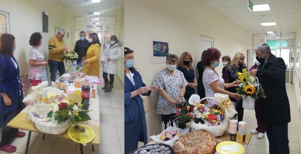 Кметът Румен Томов посети и МБАЛ „ПУЛС – Благоевград“, където също бе посрещнат с питка и ритуала „поливане“.