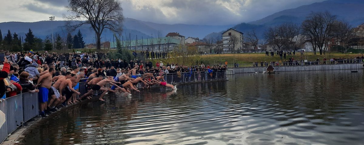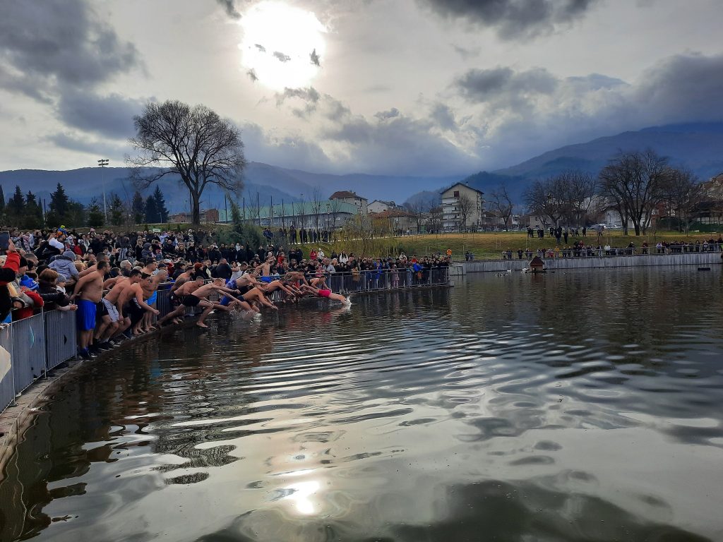 В езерото на градския парк ритуалът започна в 11.00 часа. Провежда се за втора поредна година. Кръстът, потопен във водата от отец Кирил, извади Йордан Костадинов.