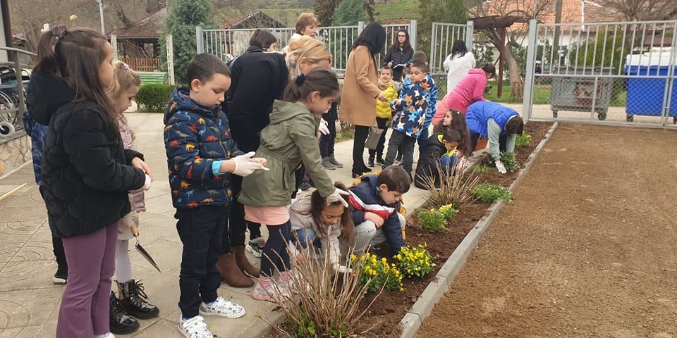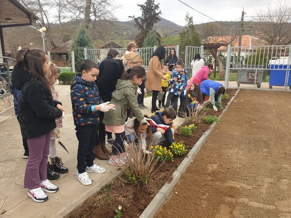 Дечица от ДГ “Радост” Сандански засадиха пъстра градина в двора на социалните центрове в село Вълково