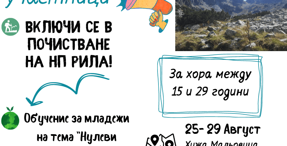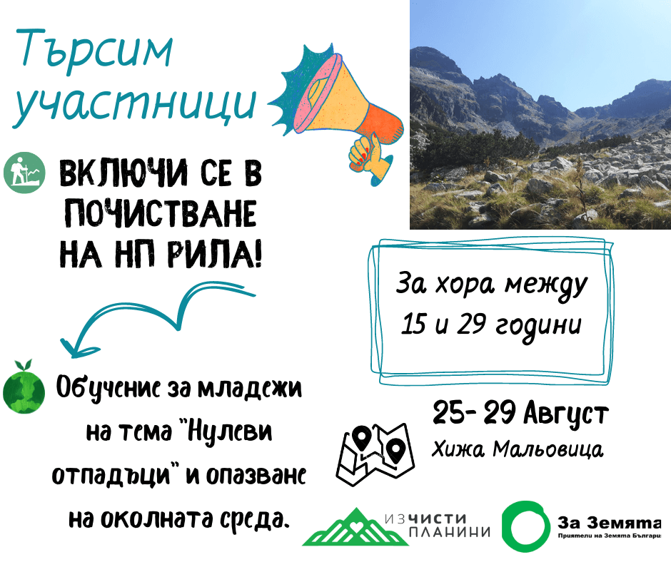 Единственото по рода си ежегодно доброволческо почистване във високопланински територии, организирано от Екологично сдружение „За Земята”, започва този четвъртък, 25 август, в НП Рила. Организаторите и доброволците се събират пред хижа Мальовица. Акцията ще продължи до 29 август. За почистването са се записали над 60 човека от цялата страна на всякаква възраст.