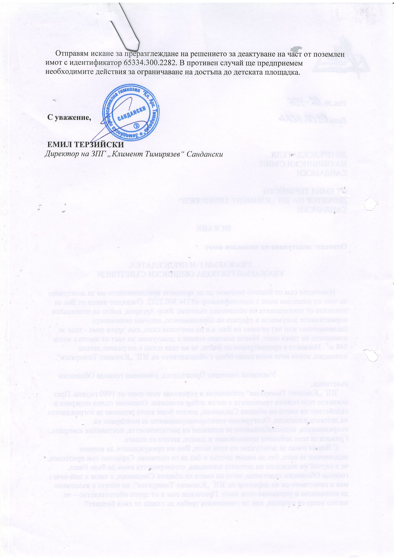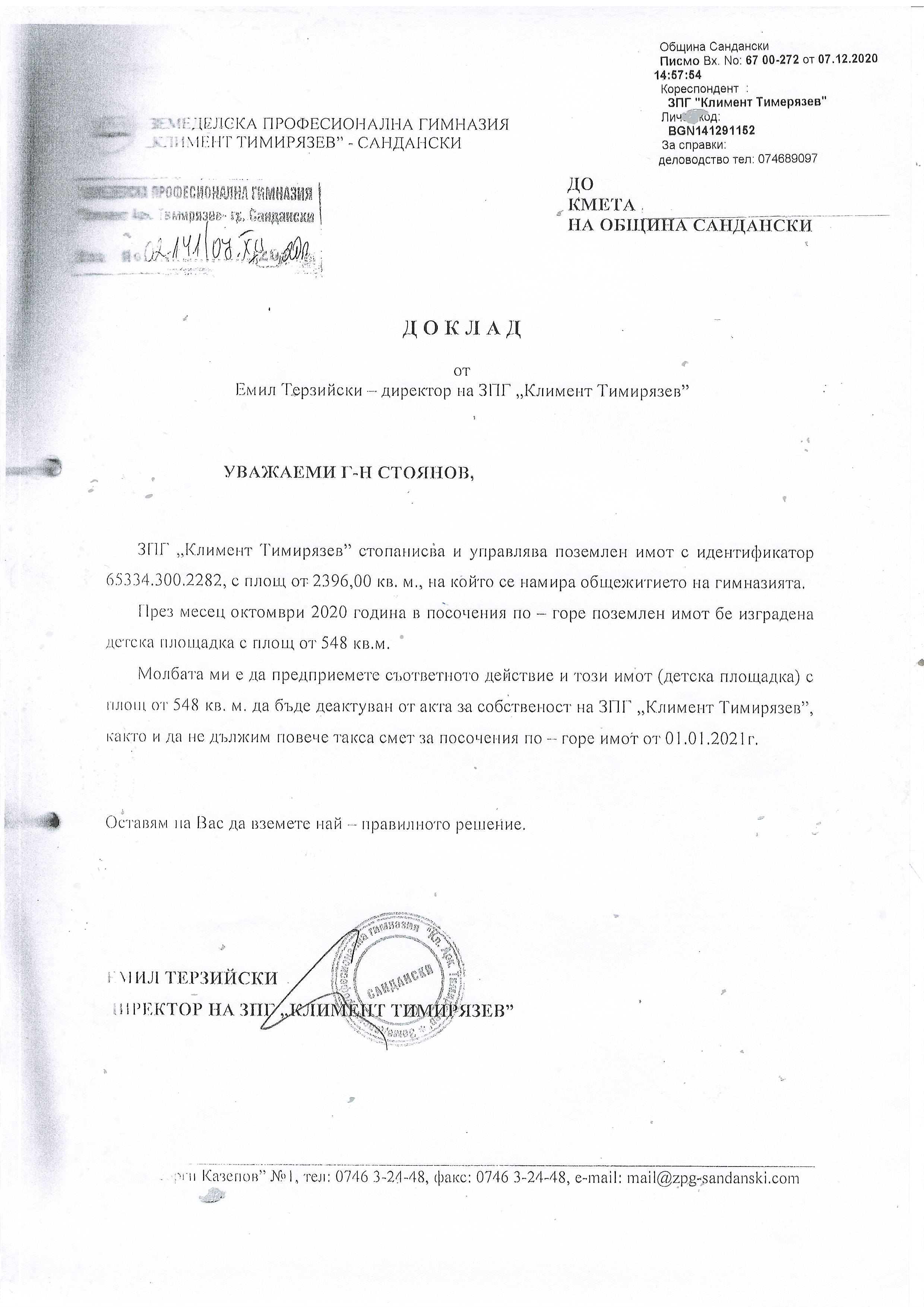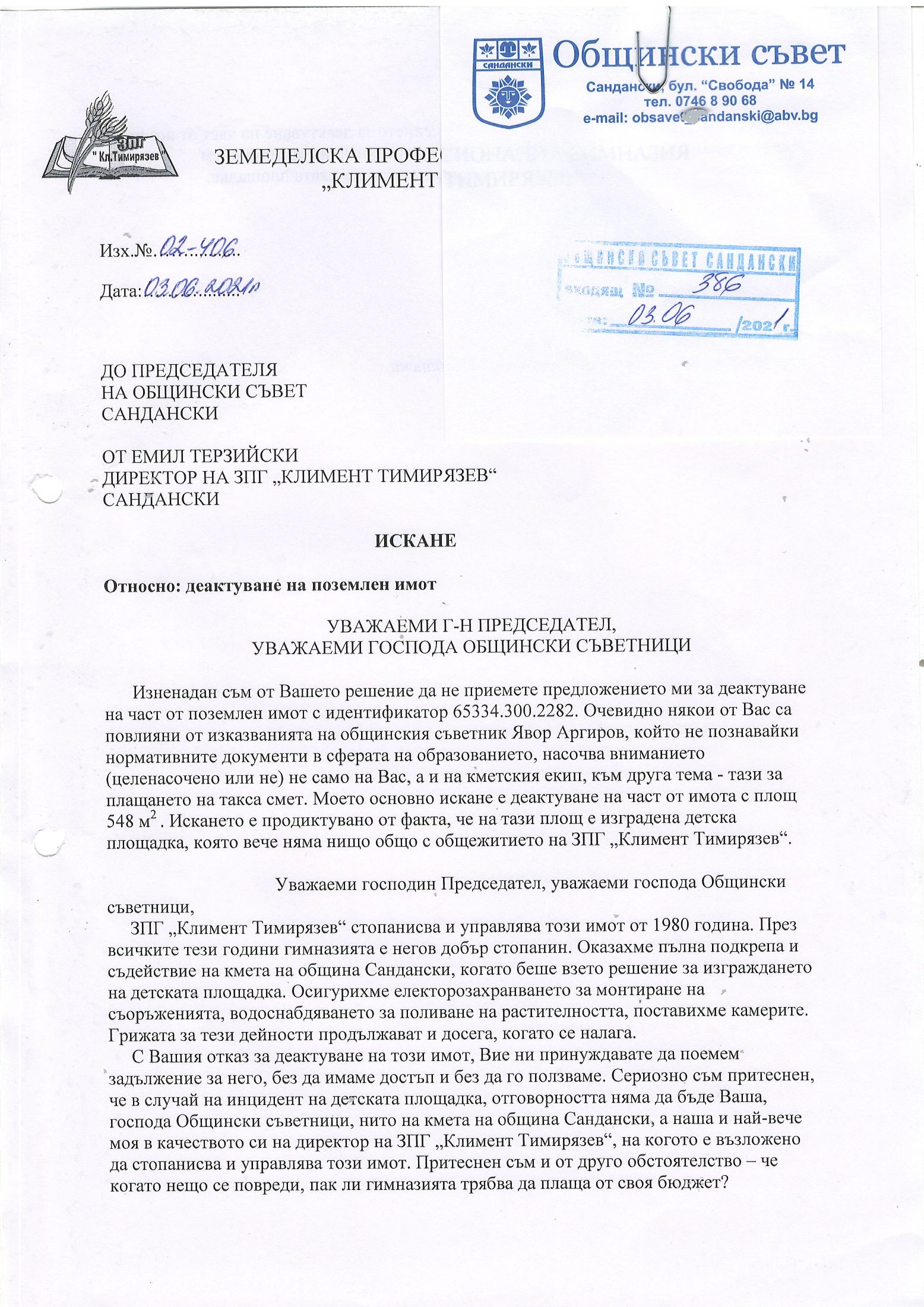 Първо, не казвате никъде за моето основно искане, а именно, че става въпрос за деактуване на част от имота на общежитието на Земеделска професионална гимназия „Климент Тимирязев“, на който е изградена детска площадка. Искане, което е породено от факта, че до въпросния имот, гимназията вече няма достъп, както и че той не се използва от наши ученици.