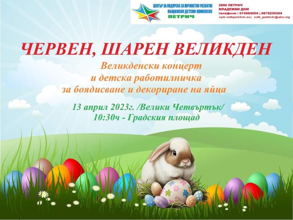 Община Петрич, ПГИТ „Проф. д-р Асен Златаров“ и ЦПЛР – ОДК организират на 13 април (четвъртък) от 10.30 часа на градския площад концерт и великденско предизвикателство за боядисване и декориране на яйца.