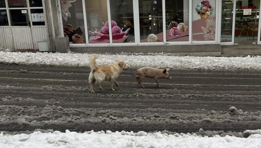 Идва Коледа : Малък прасчо се скита по улиците в Благоевград