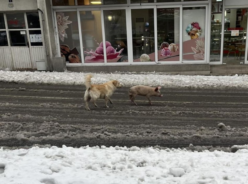 Днес обаче то е с другарче. Улично куче прави компания на прасенцето. Дуото е видяно на улица „Александър Стамболийски“.