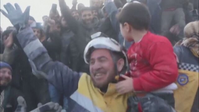 Спасителни екипи и цивилни граждани изпаднаха в бурна радост, след като цяло семейство беше извадено живо от развалините на сграда в Сирия, сринала се заради силното земетресение в Турция в понеделник.