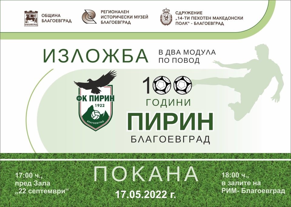 Изложбата ще бъде открита по инициатива на Община Благоевград, със съдействието на Регионален исторически музей, Сдружение „14-ти Пехотен Македонски полк“, ОФК „Пирин“ – Благоевград, ФК „Пирин лейдис“, ДЮШ „Пирин“, футболните клубове за деца и юноши „Пирин 2001“, Орлетата“ и „Хлапетата“.