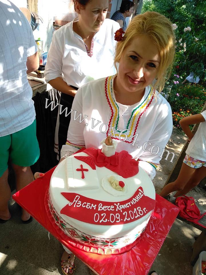 “Преди да отидем в църквата, 90-годишната баба Илинка даде благословията си на нашата дъщеря. След което тръгнахме към храма, където с усмивка ни посрещна отец Благой. Благодарна съм на отеца, че прие така присърце нашият празник. Когато всички се събрахме около малката ни дъщеря, започна и Светото Кръщение. Най-много се изненадах когато всички заедно запяха На многая лета. Нямам думи да опиша емоцията, която изпитах, когато 40 гърла запяха заедно. Около мене имаше 15 дечица, които бяха облечени в народни носии заедно с нас. След ритуала в църквата се събрахме в двора на къщата, където отпразнувахме Светото Кръщение на Николета. С гостите, които ни уважиха хапнахме печено агнешко, супа и домашна баница. Всяко семейство от гостите подари по една питка, която бе разчупена за здраве, а ние пък им подарихме домашна ракия за мъжете и кърпичка с буквата “Н” на жените. Времето бе прекрасно, децата се люлееха, родителите им извиваха хора, а малката Николетка не спираше да се радва на носията, в която бе облечена. Този ден определено не може да се опише с думи, а трябва да се почувства.” сподели развълнувано майката на Николетка.