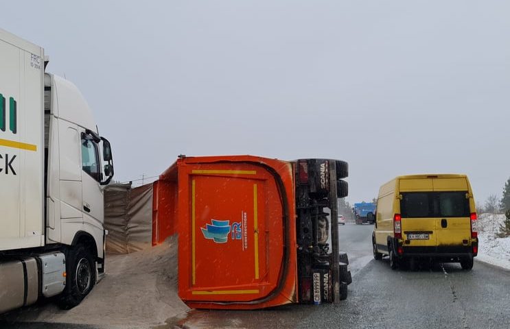 Камион с пясък се преобърна на АМ “Струма” при разклона за с. Боснек.