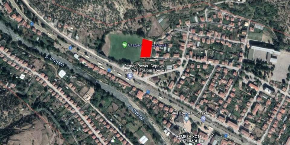 Новото мултифункционално игрище ще бъде изградено в района на стадион „Перун” гр. Кресна (червеното петно върху приложената картинка).