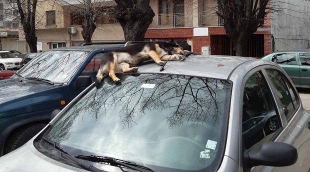 За разлика от своите събратя, това куче се държи точно като котка. Всеки ден, той полягва на слънце, но не на паважа, а на покрива на някоя кола. Там то лежи необезпокоявано цял ден.