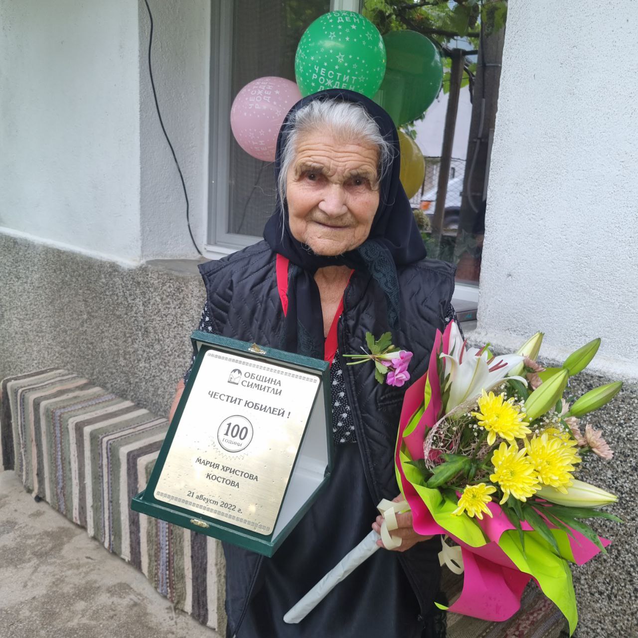 Столетницата бе изненадана в дома си от кмета на Община Симитли Апостол Апостолов, председателят на Общински съвет – Симитли Вилимир Александров и кметицата на село Железница Гергана Гиздова, които ѝ връчиха плакет и красив букет цветя.