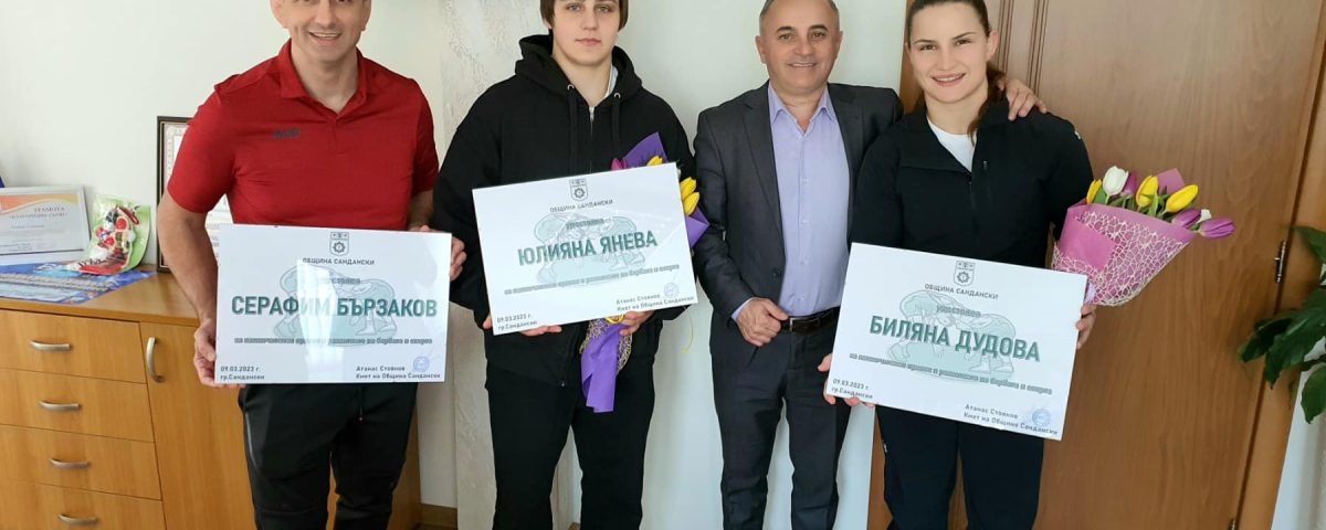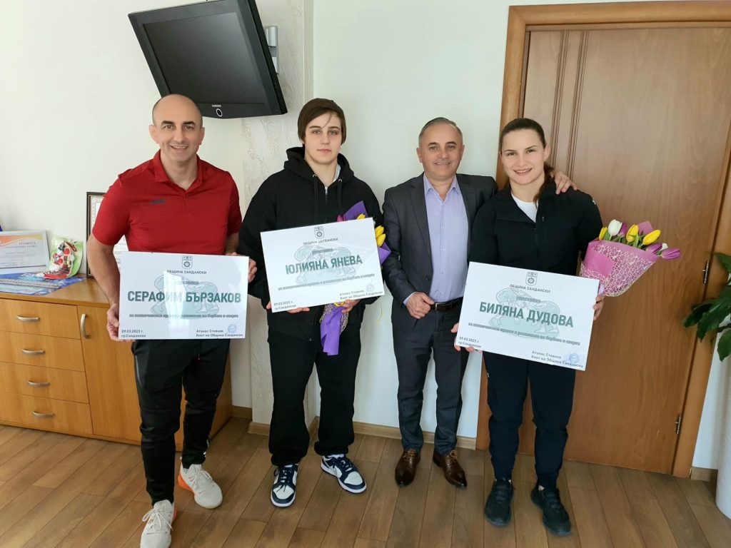 Днес, заедно с треньорите на местния клуб по борба, шампионите посетиха кметът на община Сандански – Атанас Стоянов, който им пожела успех и и още много покорени върхове в спорта.