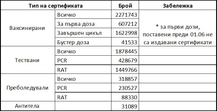 От ведомството съобщиха и точната цифра на издадени удостоверения за преболедуване на COVID-19 чрез наличие на антитела. Над 31 000 е броят на хора, които са се възползвали от новата опция за издаване на зелен сертификат.
