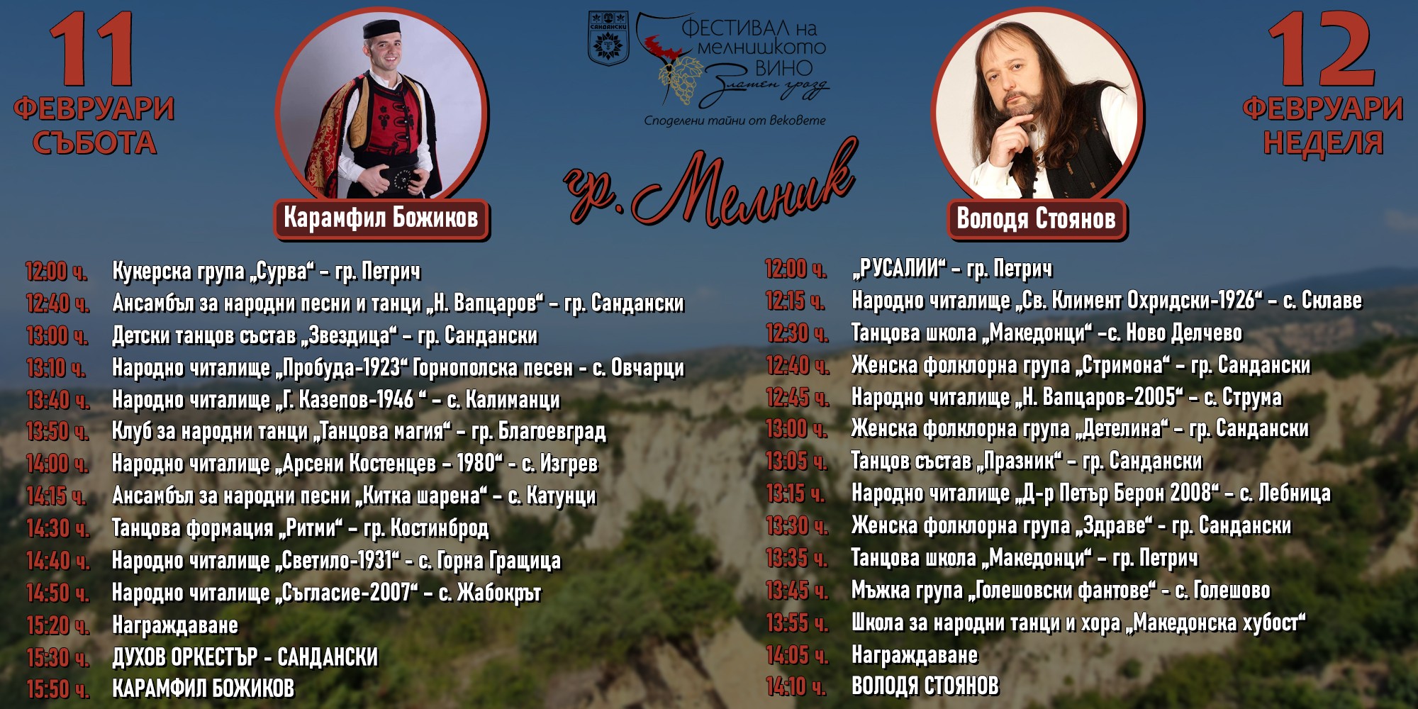 Богатата фолклорна програма, поднесена от местни и гостуващи самодейни състави и специалните ни гости, ще превърнат виненото изложение в истински празник за сетивата.