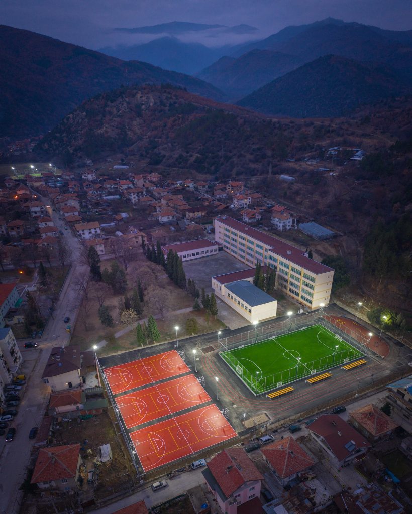 6.В северната част на имота се разполага площадка за спорт на открито, оборудвана с модерни гимнастически уреди – троен лост, успоредка, лостове за лицеви опори и др. Настилката под гимнастическите уреди е ударопоглъщаща, от каучукови плочи с червен цвят. Пистата за бягане е очертана с ярък червен цвят върху новоположения асфалт.