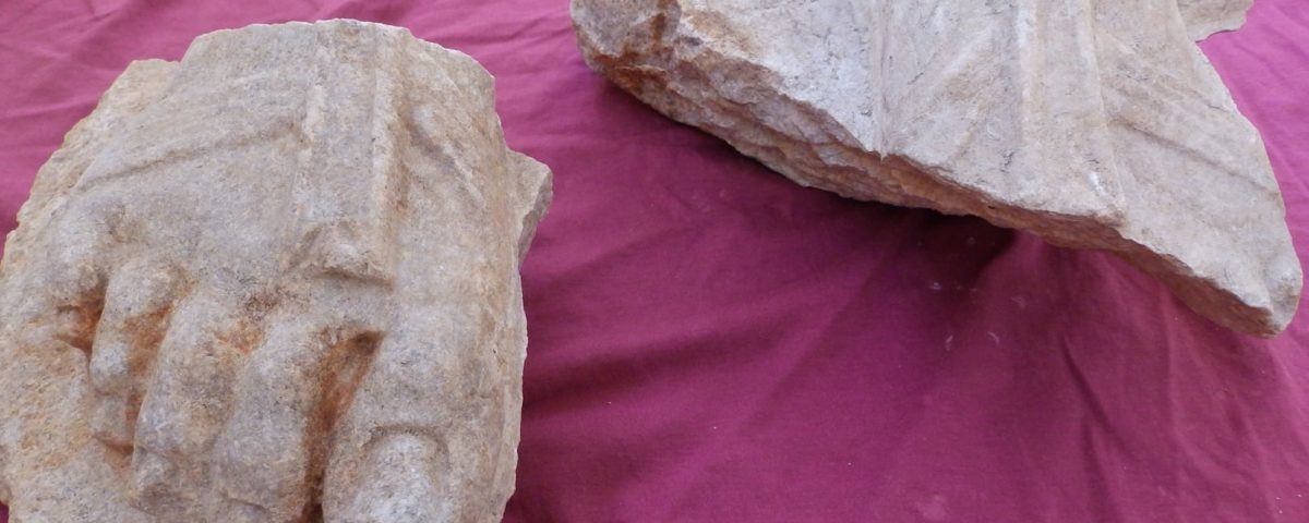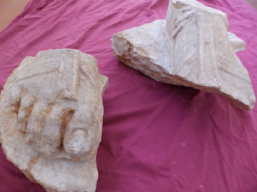 ДВЕ МРАМОРНИ ЧОВЕШКИ СТЪПАЛА и дясно рамо с част от дреха (химатион или тога) бяха намерени в рамките на едно и също помещение от западния портик на форума на Хераклея Синтика вчера.