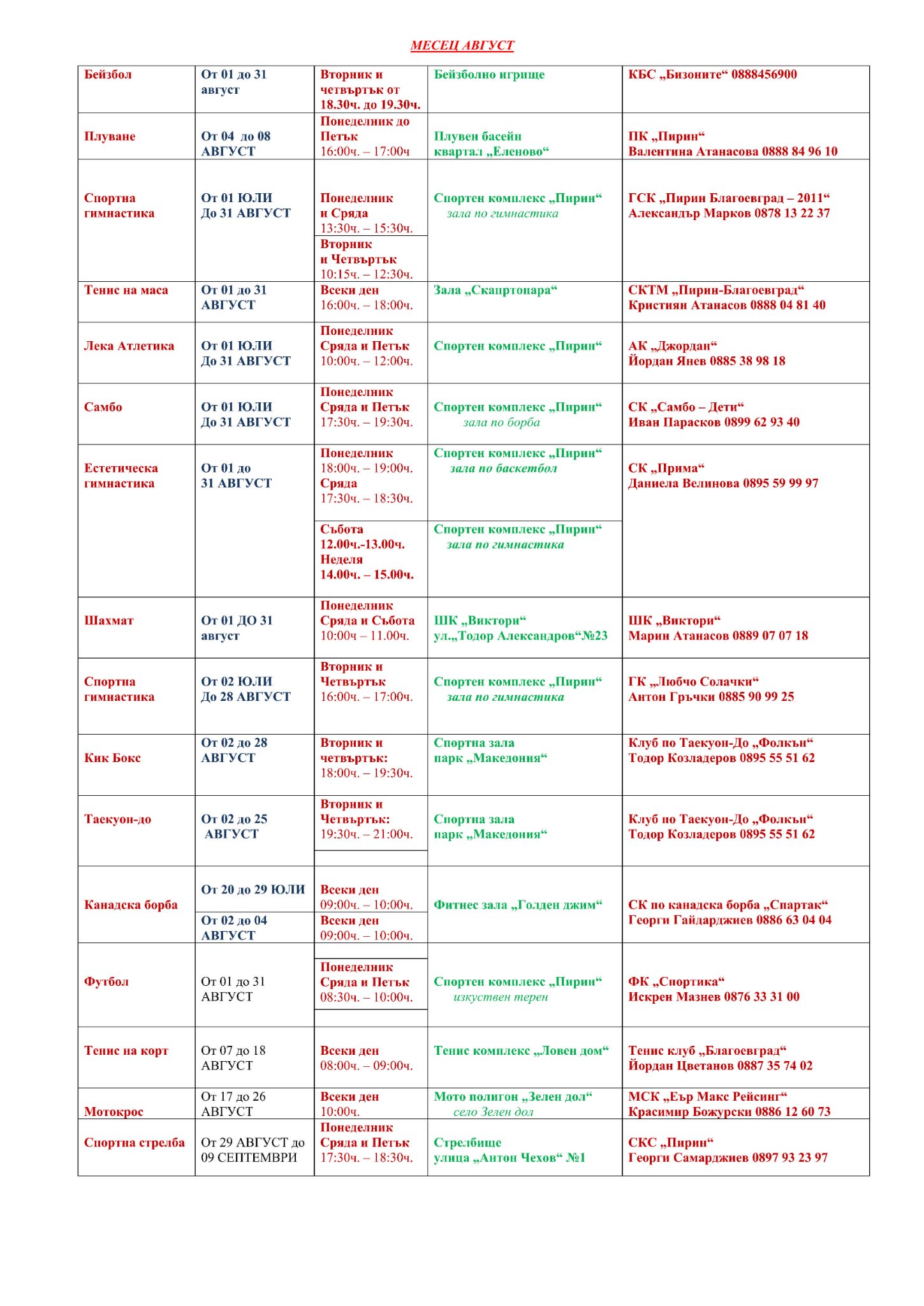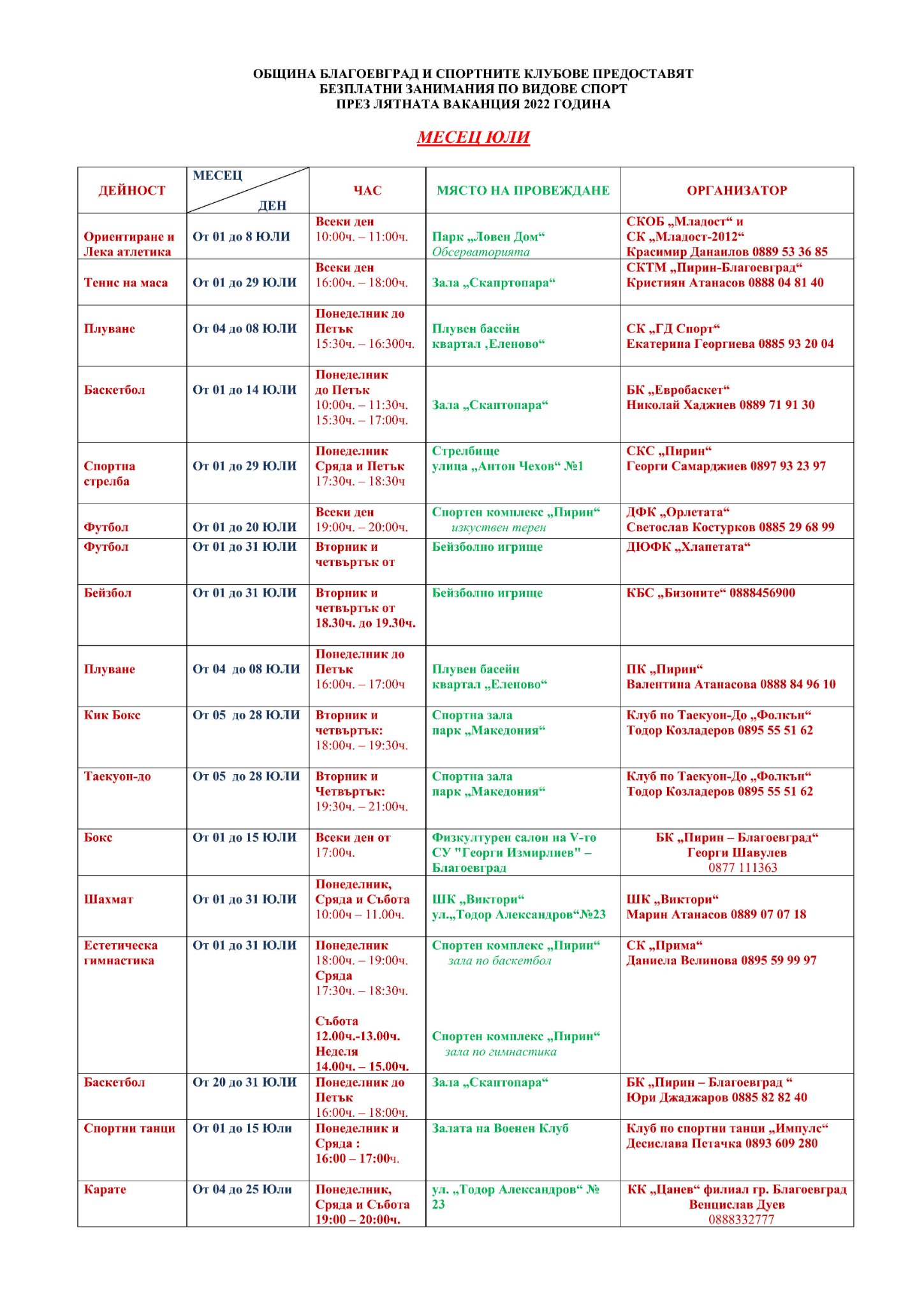 Община Благоевград и спортните клубове на територията на областния център организират безплатни занимания за учениците през лятната ваканция. Те стартират от 1 юли и ще продължат до края на месец август, като се провеждат по предварително изготвен и утвърден график.