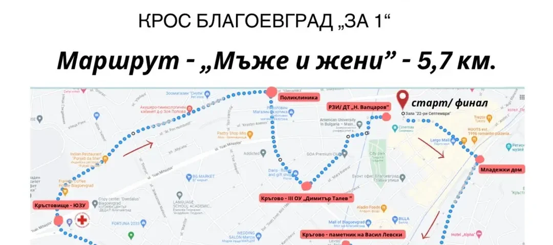 Община Благоевград организира крос под надслов „ЗА 1“, чийто старт ще бъде даден в 10.00 часа на 7 октомври /събота/ 2023 година пред зала „22 септември“. Състезателите ще бъдат разделени в две категории: „Мъже и жени“ и „Девойки и юноши до 14 години“.