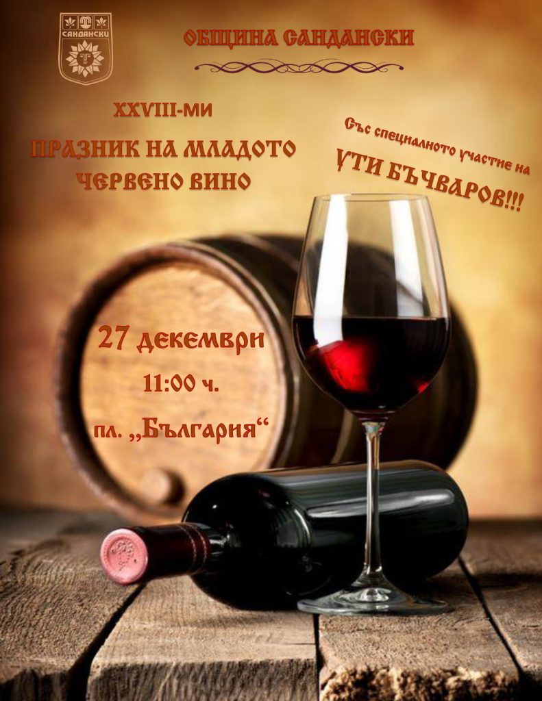 На 27.12.2022 г. от 11:00 ч. на площад „България” за двадесет и осми пореден път в Сандански ще се проведе Празник на младото червено вино. По традиция община Сандански организира конкурс за най-добро младо вино, в който могат да вземат участие всички винопроизводители от региона. Те трябва да предоставят 1, 5 л. вино с информация за сорта, населеното място и местността на лозовия масив. Виното ще се приема в Туристически информационен център /до ГУМ/ от 12.12.2022 г. до 26.12.2022 г. В празничния ден –27.12.2022 г. качествата на божествената напитка ще бъдат оценени от специалисти – енолози. Те ще определят кой ще бъде тазгодишният носител на титлата „Цар на виното”. Тази година, община Сандански е подготвила кулинарна изненада за всички, които освен, че ще могат да се наслядат на чаша пенливо вино, ще се докоснат до магията на приготвяне на традиционно ястие от самия Ути Бъчваров. Празникът на виното и вкусната храна ще бъде обогатен и с богата празнична програма с традиционни македонски ритми.