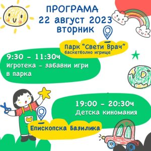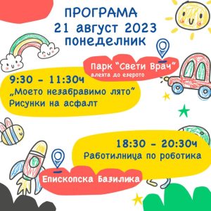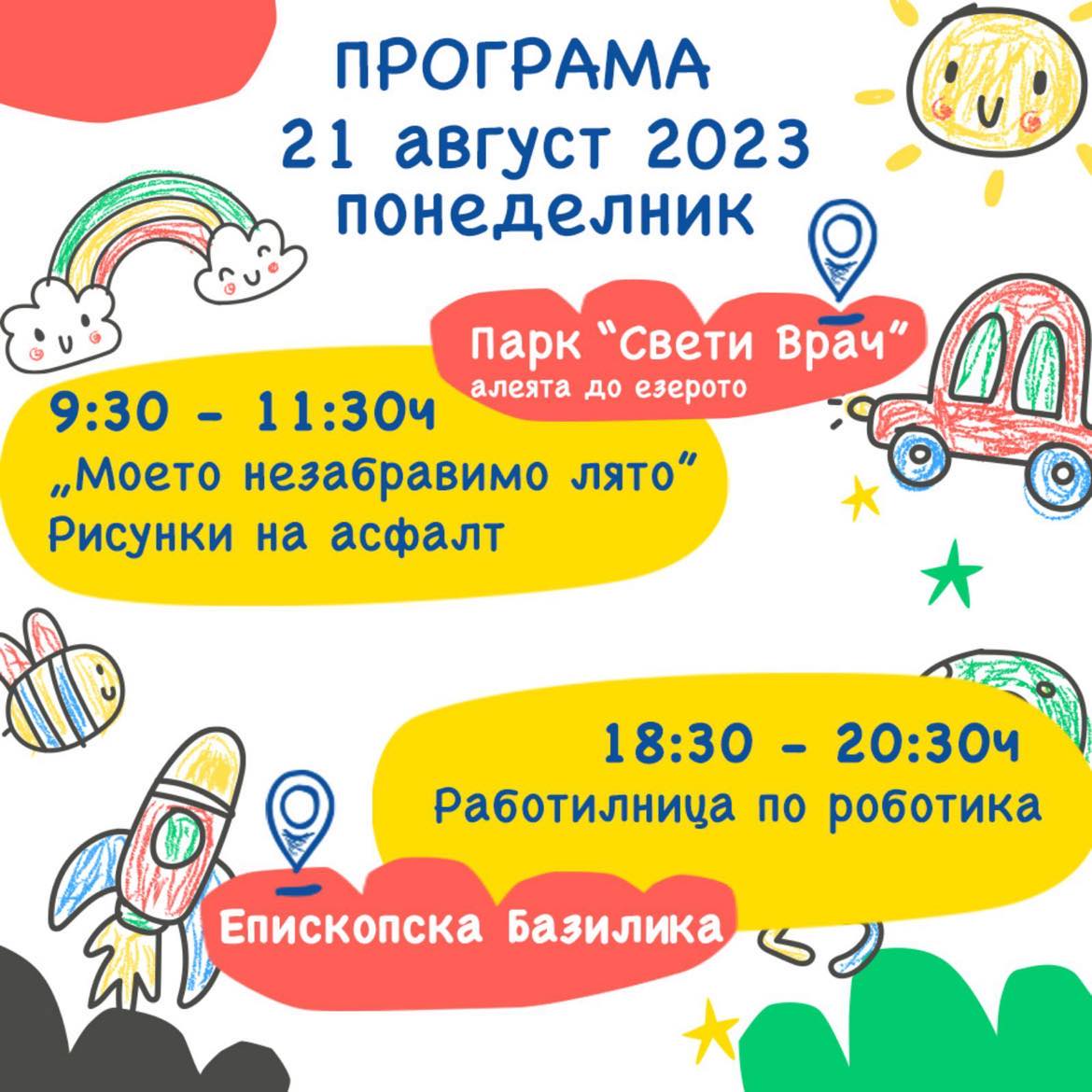 ℹ️Програмата включва интересни и забавни дейности, които ще развият уменията и творчеството на вашите деца. Очаквайте работилници, спортни игри, творчески занимания и много други изненади!