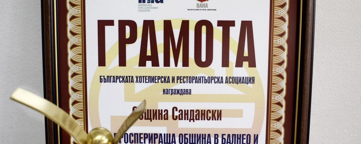 И тази година на церемонията, община Сандански отново намери своето място с приз за „Най-просперираща община в Балнео и СПА туризма на 2017 година“. Наградата бе връчена лично на кмета на Община Сандански – Кирил Котев от Илия Пасков – член на Управителния съвет на Българската хотелиерска и ресторантьорска асоциация.