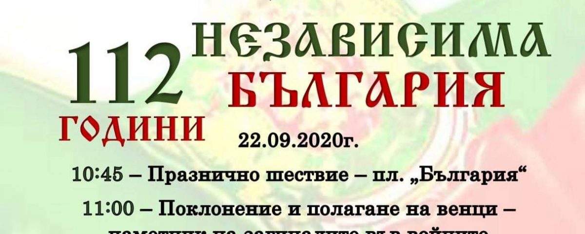 На 22 септември /вторник/, от 10:45 ч. ще се проведе празнично шествие от пл. „България“ до Паметника на загиналите във войните, където съдбоносната дата ще бъде почетена с ритуал по поднасяне на венци и цветя.