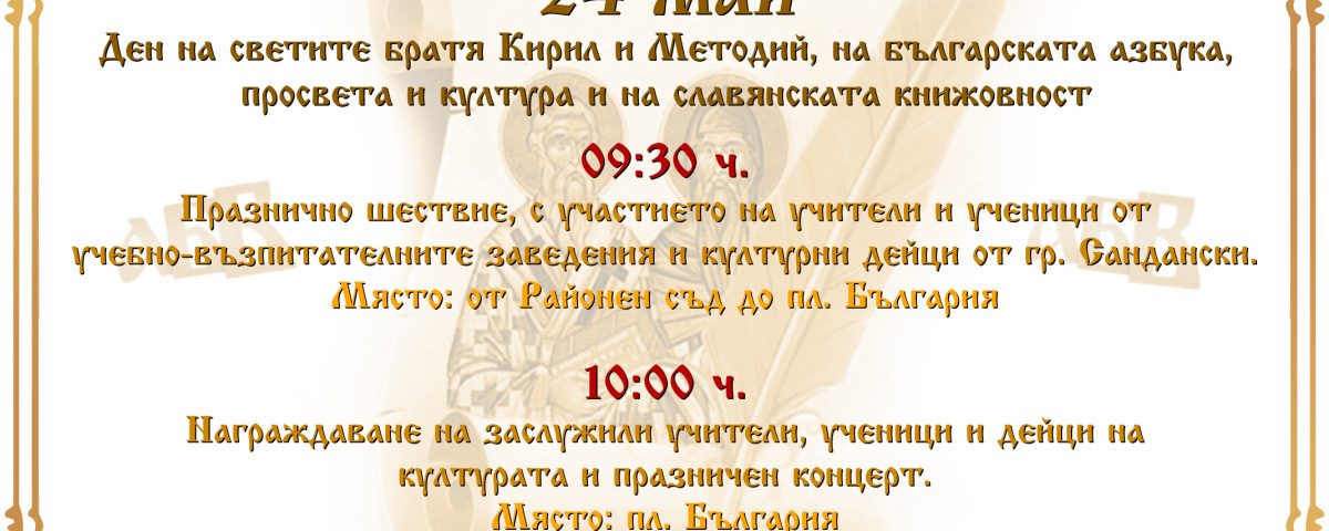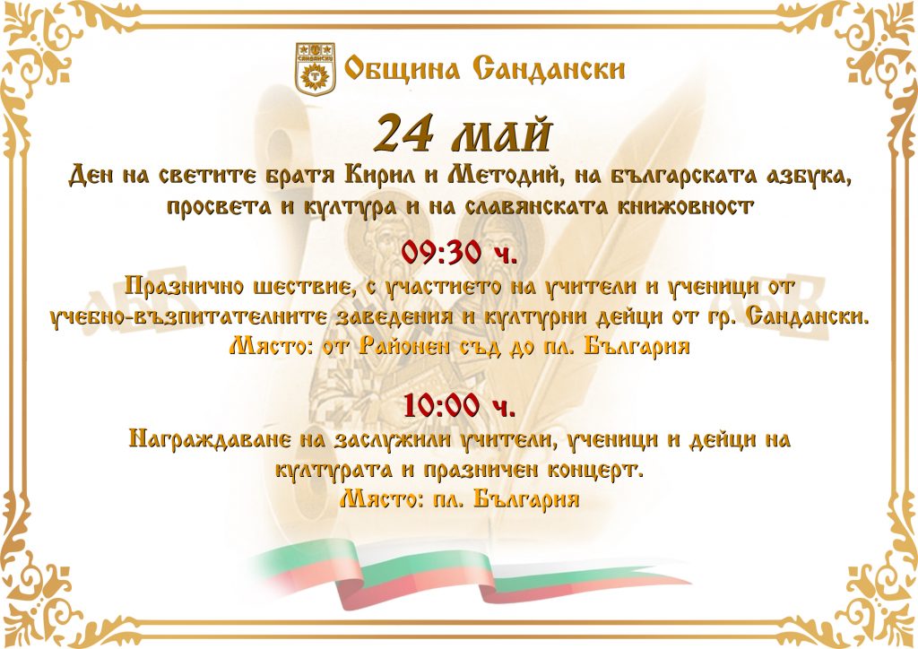 Община Сандански ще отбележи 24 май с тържествено шествие и празничен концерт!
