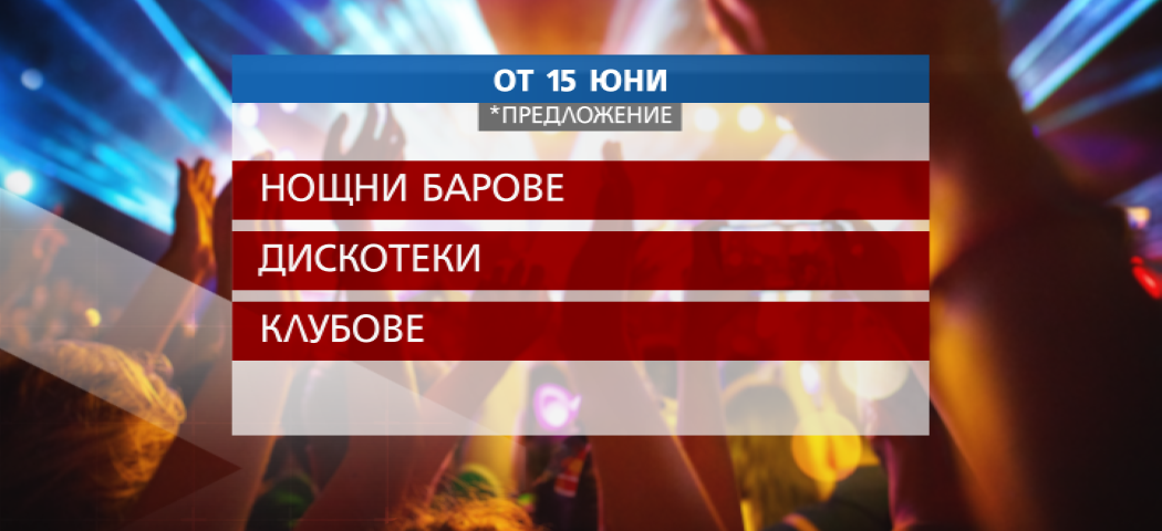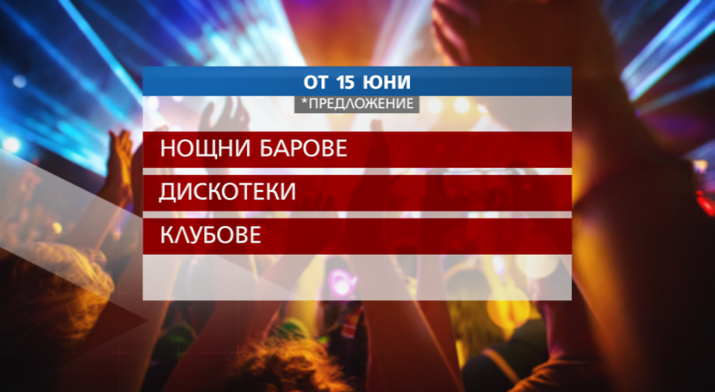 Нощните клубове, дискотеките и барове ще отворят врати от 15 юни. Това е поредна стъпка на правителството по пътя на отхлабването на мерките срещу разпространението на коронавируса у нас, научи NOVA. От 1 юни ще бъде разрешено на ресторанти, кафенета и сладкарници да работят и в закрити помещения. Ще се спазват същите мерки за работа, които важаха и до момента за градините.