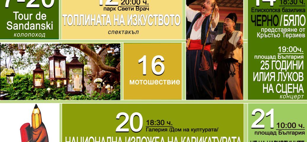 Изкуството отново завладява сетивата ни на 20 септември, 18:30 ч. в Художествената галерия в Дома на културата с Националната изложба на карикатурата. На следващия ден – 21 септември, в 10:00 ч. на пл. „България“ даваме начало на колопохода „Не на наркотиците“, а от 20:00 ч. на Летния театър Национален музикален театър – София представят своя концерт-спектакъл „Музикална феерия“.