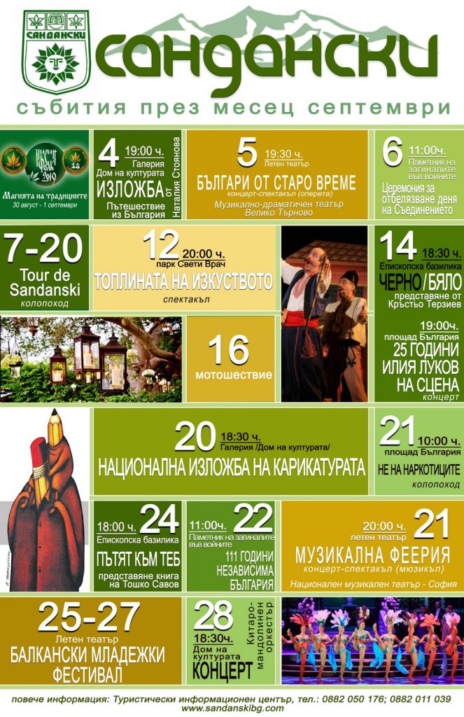 Месец септември, освен прохлада, първи училищни трепети и два официални празника, ни носи разнообразна палитра от събития за всеки вкус. И тъй като последният ден от емблематичния за град Сандански фестивал „Пирин Фолк“ и на първия ден от месец септември, имаме удоволствието да ви поканим в хладината на Летния театър, за да се насладите на Магията на традициите. Пирин Фолк започва на 30 август, продължава на 31 август, а Гала вечерта бележи първият ден от месец септември.