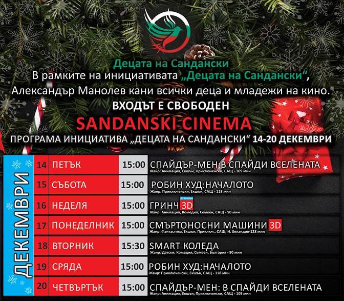 В рамките на инициативата „Децата на Сандански“, Александър Манолев кани всички деца и младежи на кино. Входът е свободен. Кампанията ще се проведе в периода 14 декември до 20 декември 2018 г. и се организира с подкрепата на Кино – Сандански.