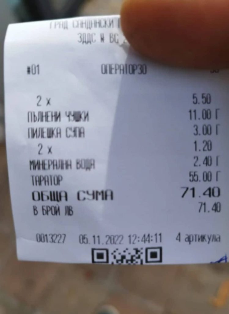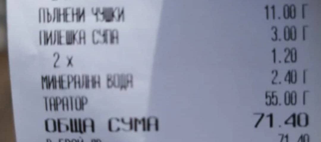 Касова бележка от заведение в Сандански подпали социалните мрежи. На фискалния бон се вижда, че клиентите са поръчали пилешка супа, два пъти пълнени чушки, две минерални води и таратор, а общата крайна сума е над 70 лева.