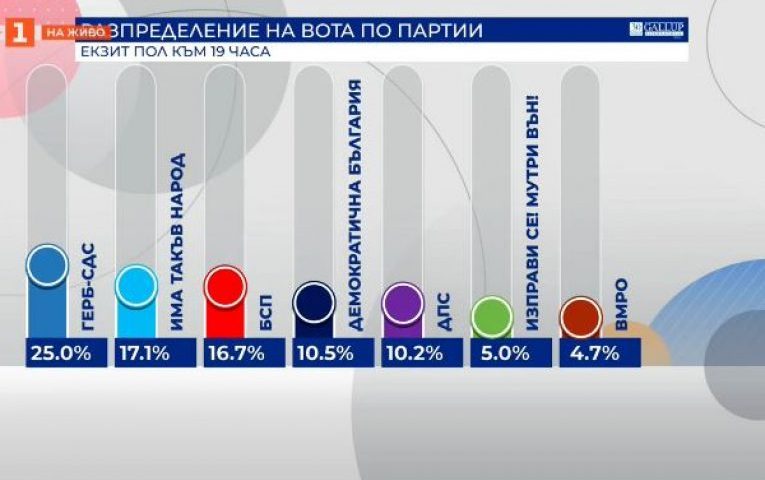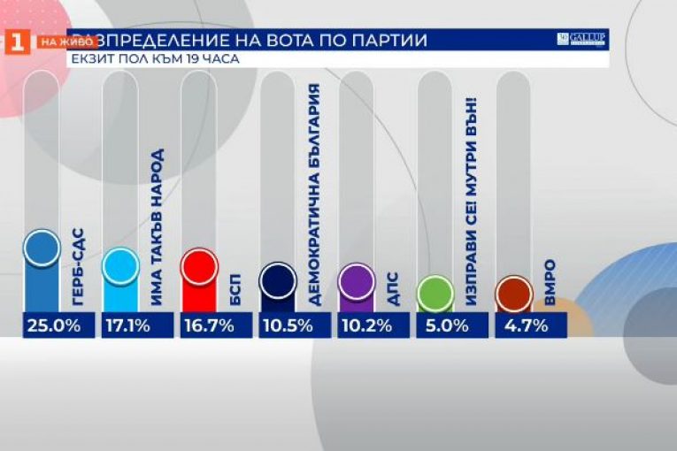 Според данните от екзитполовете на „Маркет ЛИНКС“, оповестени в ефира на bTV, нито една от партиите обаче не събира достатъчно доверие, за да управлява сама, показват числата на социолозите.