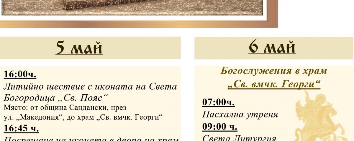 Иконата на Света Богородица “Св. Пояс” ще бъде посрещната в манастир “Св. безсребреници Козма и Дамян” на 6 май – Празник на град Сандански, в 12:00 часа.