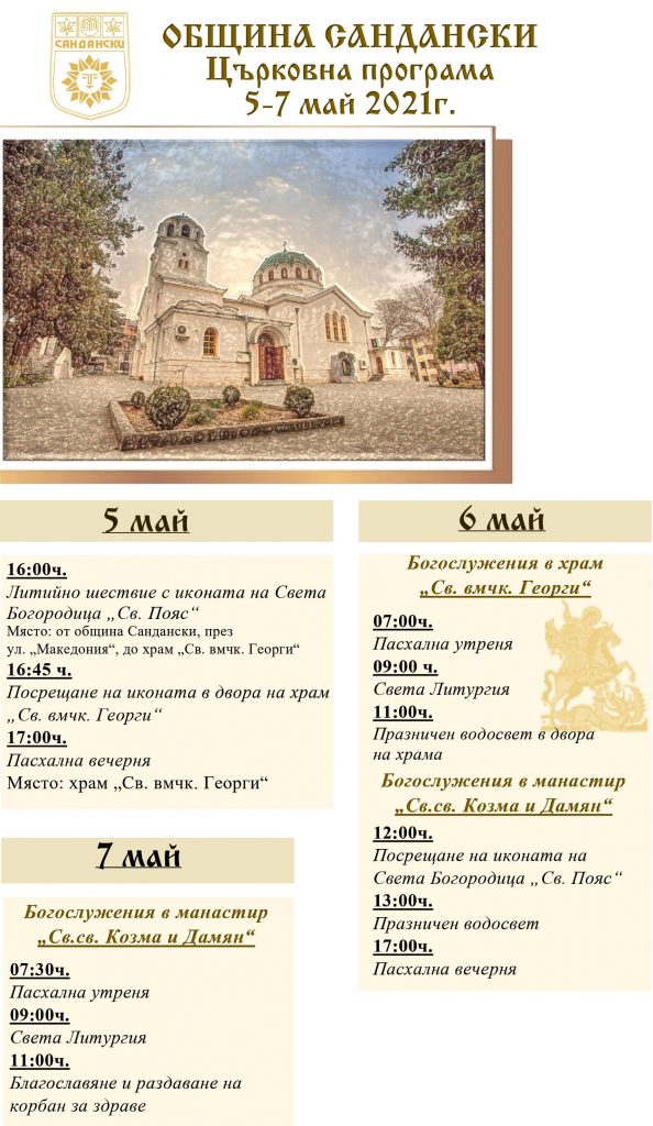 Тази година празникът на град Сандански съвпада с деня на св. Георги Победоносец и с храмовия празник на църквата „Св. Георги” в града и затова св. Литургия ще бъде отслужена в храма.