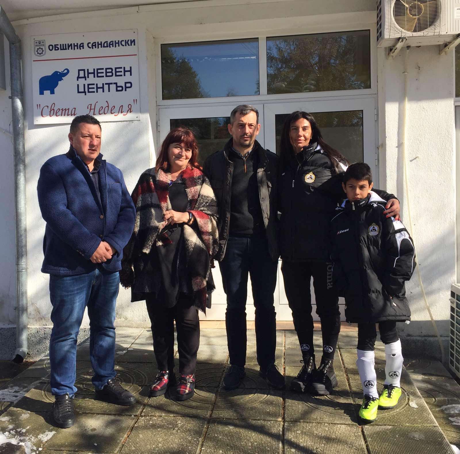 Общинските съветници организираха среща с ръководството на дневния център. От страна на ПФК „Славия“ в нея участва Роксана Кирилова, която е носител на титлата Мисис България и която е инициатор на редица благотворителни инициативи. Тя връчи и дарението, което включва футболни топки, спортни екипи и лакомства. „Този жест е още по-голям защото е от деца за деца. От името на Община Сандански мога да изкажа само голяма благодарност“, посочи общинския съветник Стоян Стоев по време на срещата.