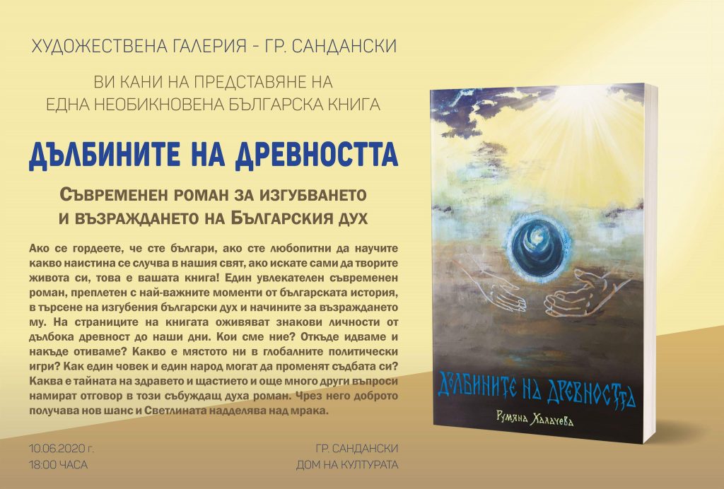 Румяна Халачева ще представи своята книга „Дълбините на древността“ на 10 юни /сряда/, 18:00 ч. в Художествената гралерия, в Дома на културата, град Сандански.