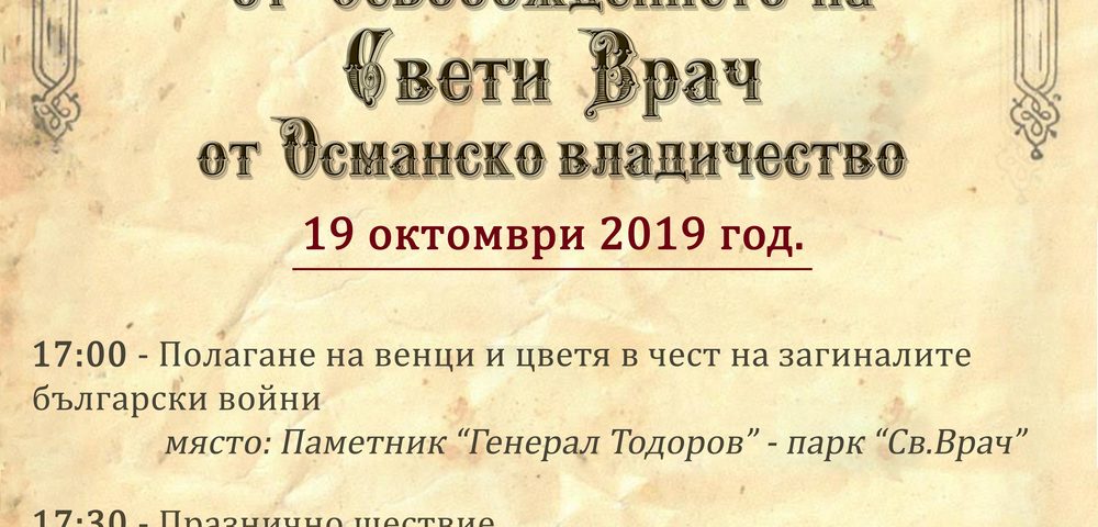 На 19 октомври /събота/, в 17:00 ч. пред Паметника на водача на славната седма пехотна Рилска дивизия – ген. Георги Тодоров в парк „Свети Врач“, ще бъдат поднесени венци и цветя в чест на героите, отдали живота си за България.