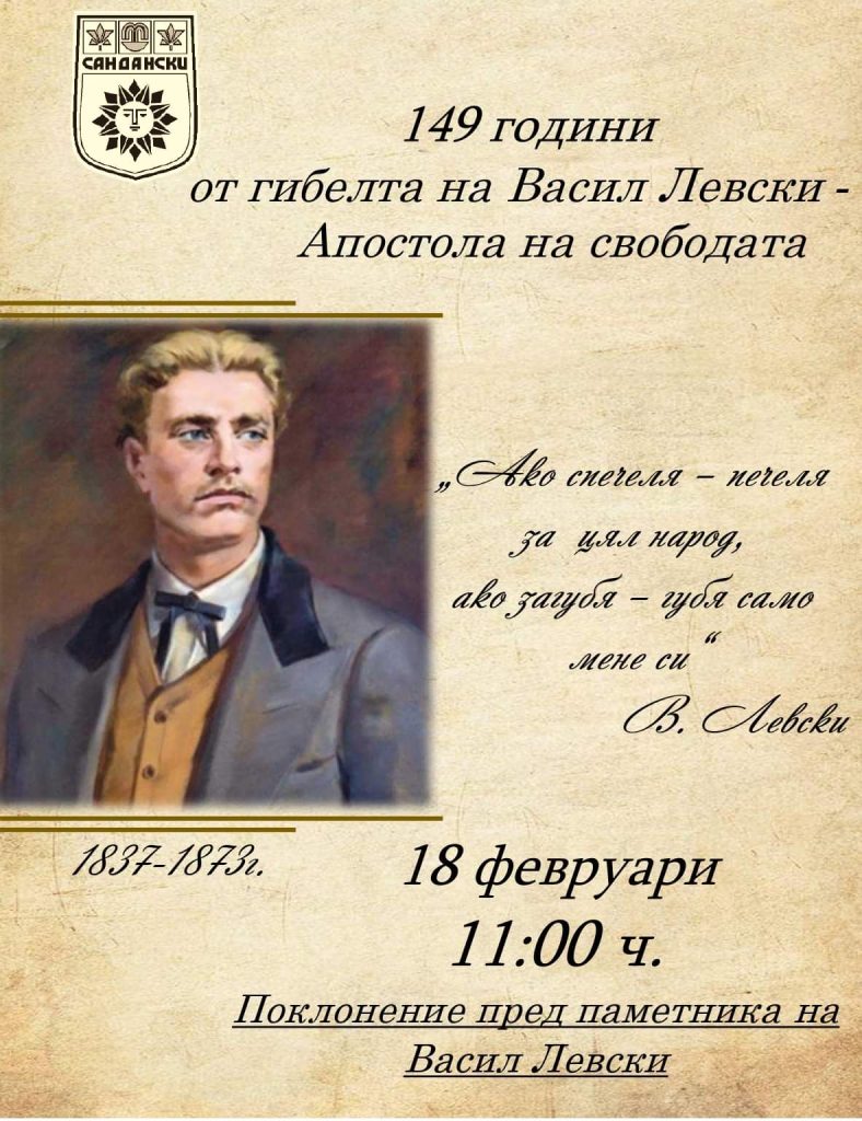 На 18.02.2022 г. (петък) на паметника на Васил Левски, от 11:00 ч., Сандански ще отбележи 149 години от гибелта на Апостола на свободата.
