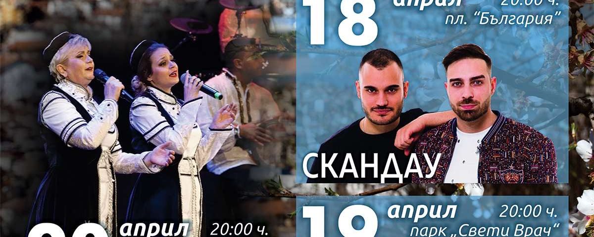 ✅Празничните прояви, посветени на Празника на град Сандански започват още на 18 април /вторник/ с любимите СКАНДАУ. Те завлядават площад „България“ с изпълненията на най-популярните си хитове. Начало на концерта: 20:00 ч.