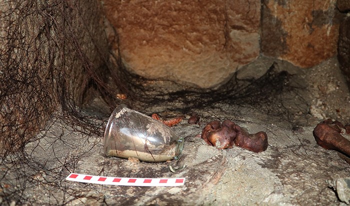 Стъклена чаша, глинена лампа и 16 бронзови монети са намерени в разкрития гроб.