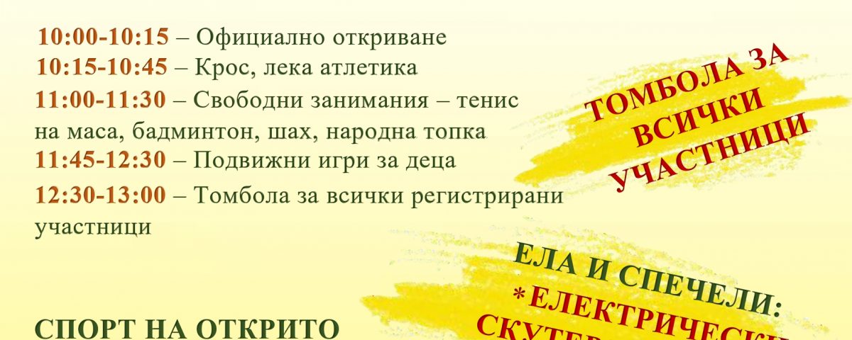 А всички деца, участващи в активностите на Спортния празник ще участват в томбола с атрактивни награди – електрически скутер/тротинетка/, велосипед и тротинетка.