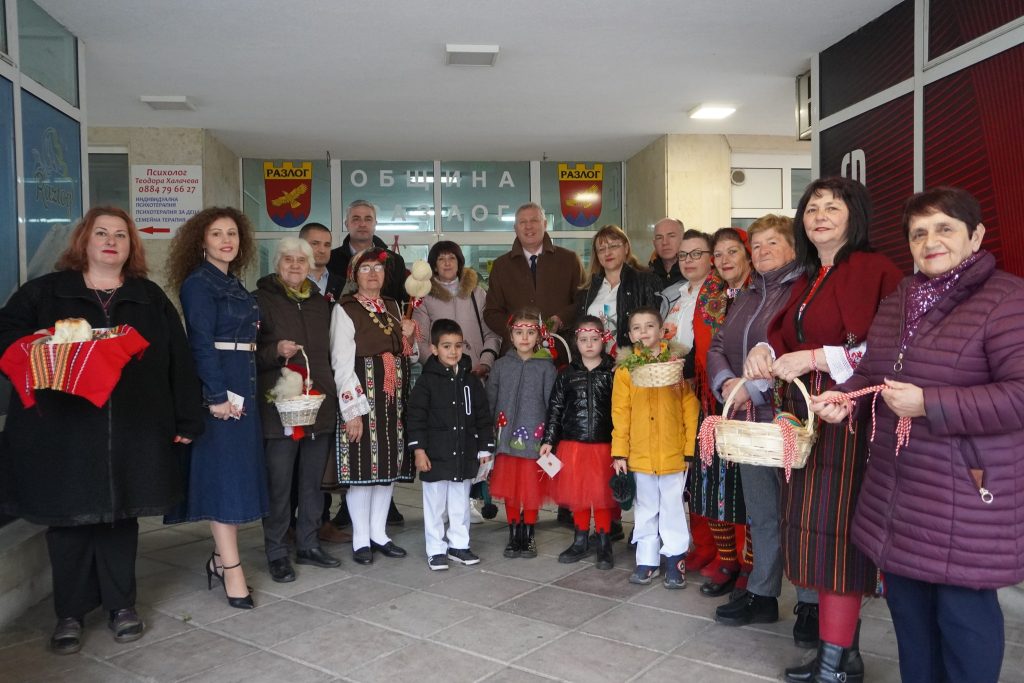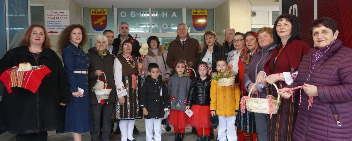 Пременени като мартенички и облечени с пъстри носии, малчугани от ДГ “Ален мак” – група “Мечо Пух” и ученици от ОУ “Никола Парапунов”, СУ “Братя Каназиреви”, РПГ “Никола Стойчев”, ПГ по транспорт и ПГ по МСС зарадваха лично кмета на община Разлог инж. Красимир Герчев, адв. Иван Димитров (председател на Общински съвет-Разлог), зам.-кметовете инж. Гергана Костова, г-н Христо Зайков и г-н Славчо Фарфаров, както и служители от общинска администрация, с пъстри мартеници, празнични песни, блага питка и наричания за здраве и късмет.