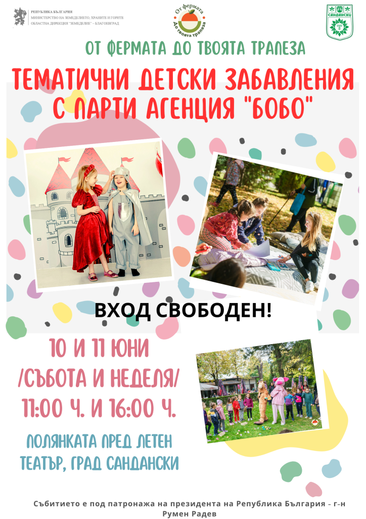 С парти агенция ,,Бобо”, която е част второто издание на Земеделски форум ,,От фермата до твоята трапеза”, децата на гр. Сандански ще могат да се забавляват и играят.