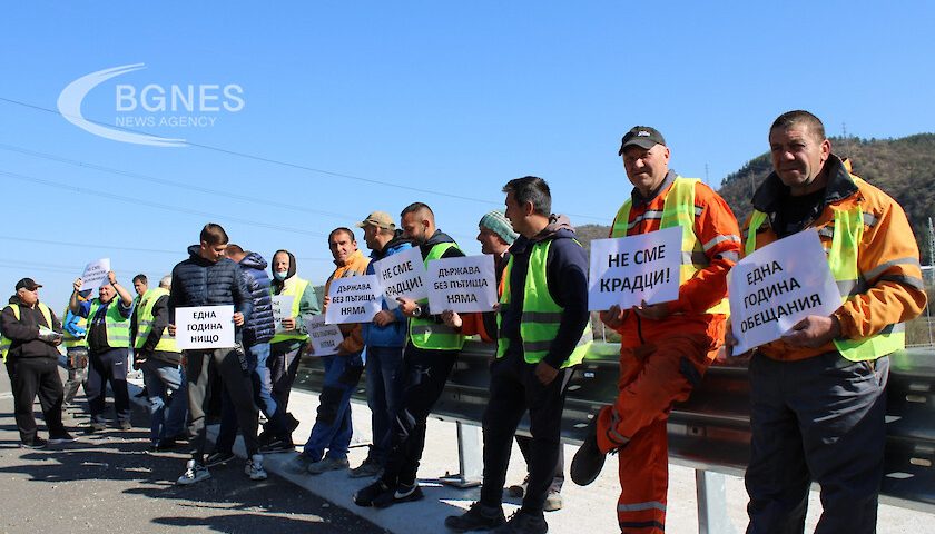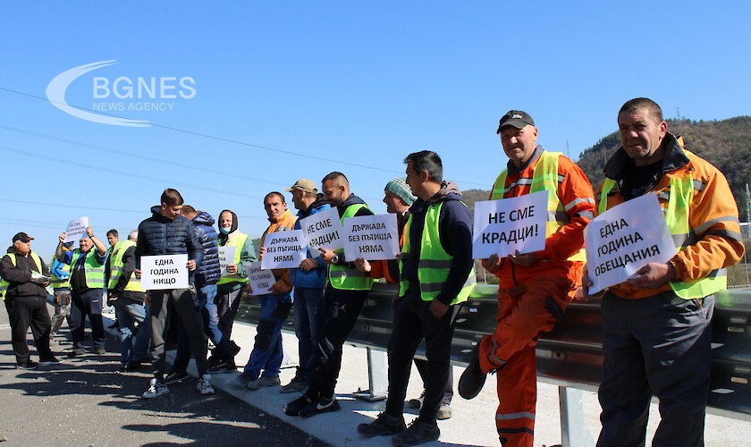 Работници на пътностроителната фира “ГромаХолд” протестираха днес с плакати и рев на клаксони в края на Автомагистрала Струма край Благоевград. Протестът бе мирен, пътните строители искаха сигурност, за да работят, нямаше блокади. „Как да се строи без пари, получаваме си заплатите за сега, но пари трябва да има, как да се построи нещо до 2025 или 2030 г., като не е започнато“, оплакаваха се работниците. „А не се ли работи-какво става, няма пари и загиваме, това е истината с две думи. Съгласни сме като приключим един обект, да проверят какво сме свършили и след това да ни платят. Няма ли пари-загиваме“, каза Александър Мутафчиев.