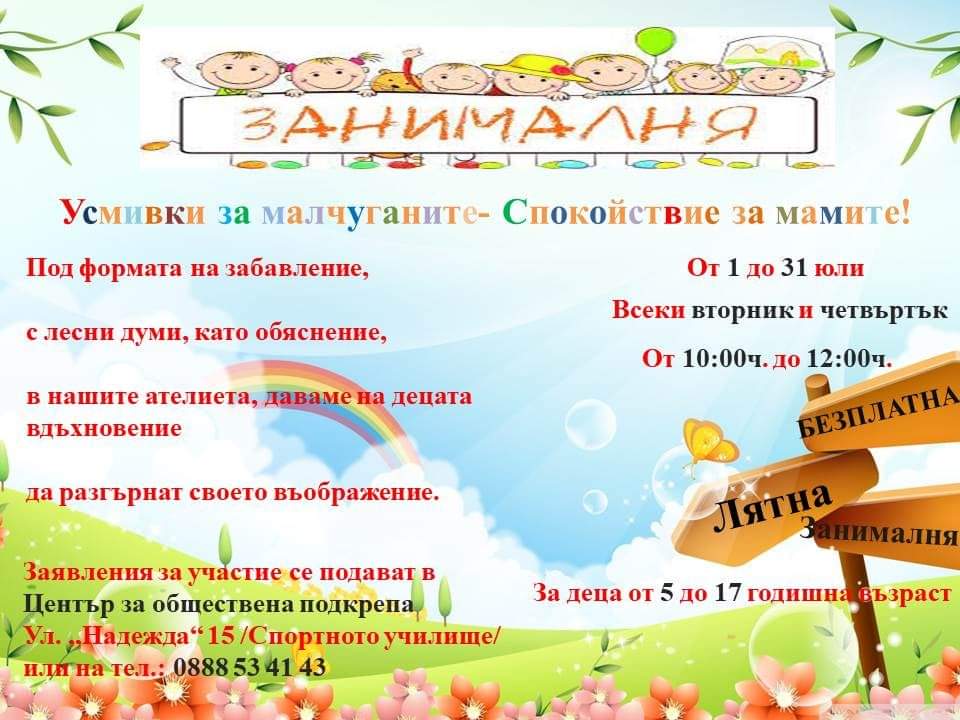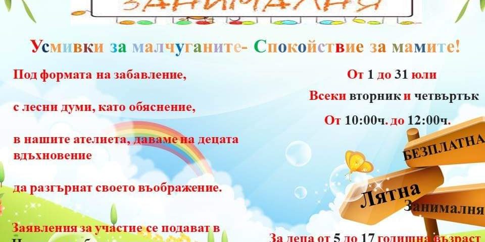 Лятната ваканционна занималня ще бъде от 1 юли до 31 юли. Ще се провежда всеки вторник и четвъртък, от 10:00 ч. до 12:00 ч.